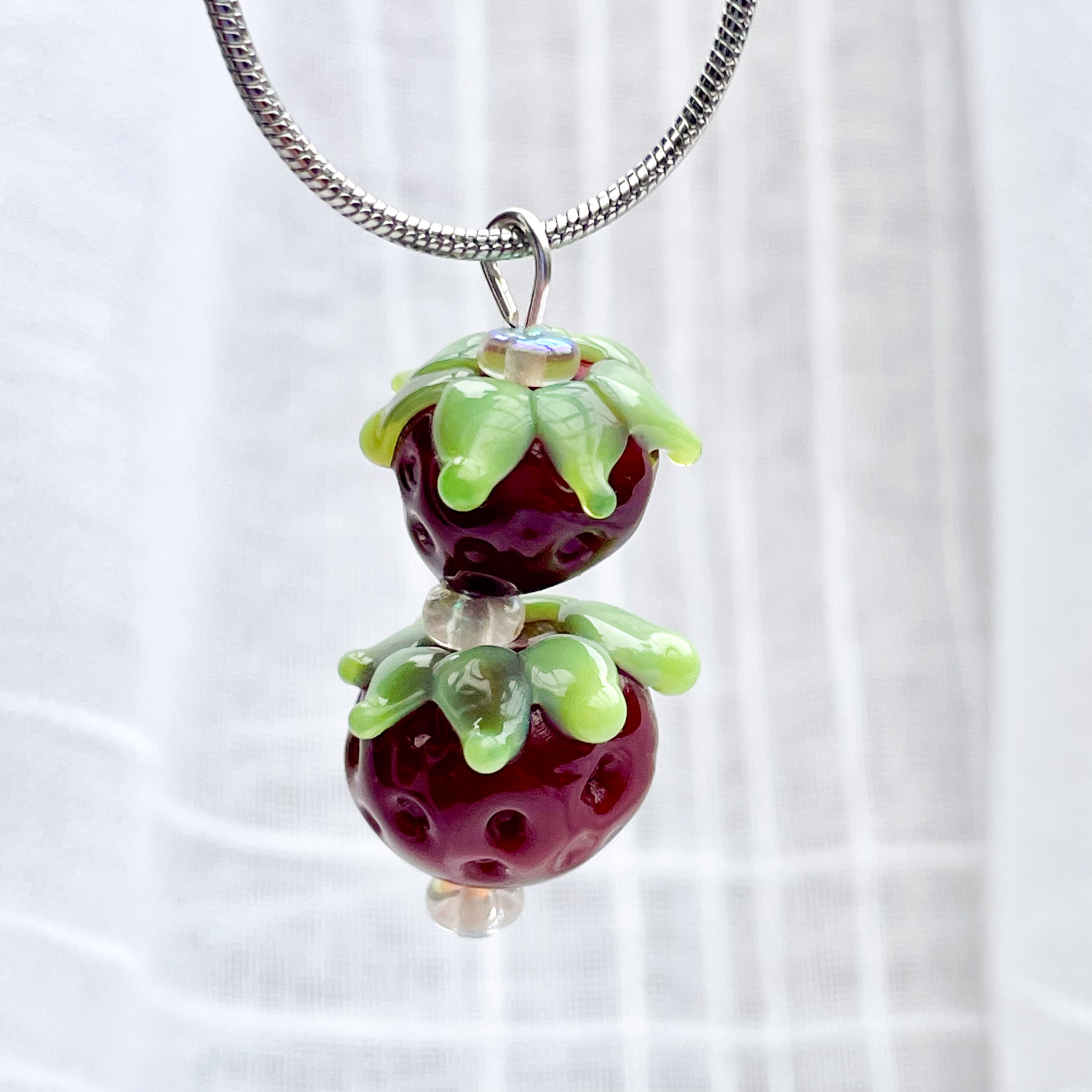 Strawberry beads are a rich red with light green leaves.