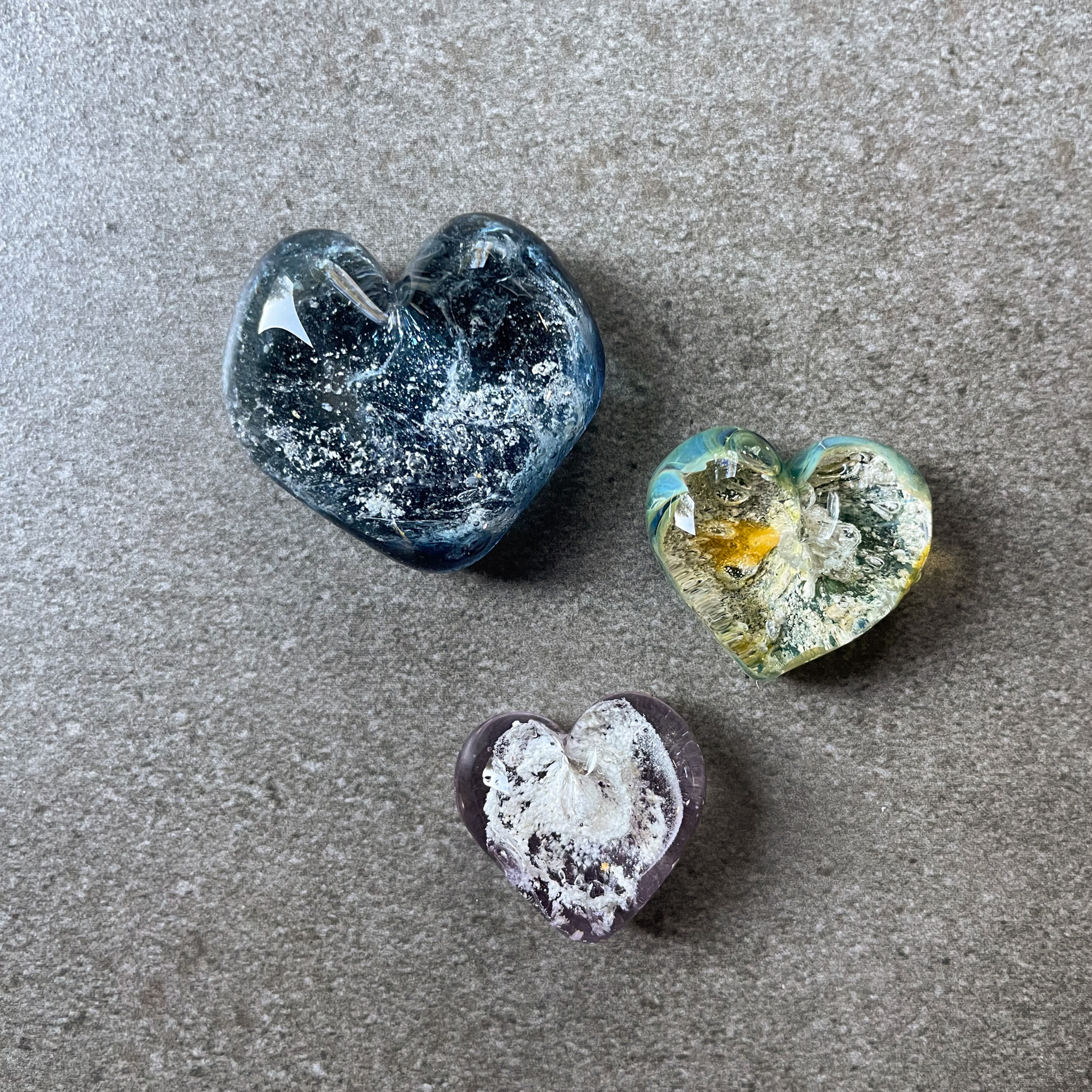These Hearts are a unique way to capture and preserve your loved ones remains. I twist in a color of your choice and a line of the ashes to create these Hearts. Keep these as touch stones/pocket tokens, desk decor or by adding a magnet you can put these Hearts anywhere.