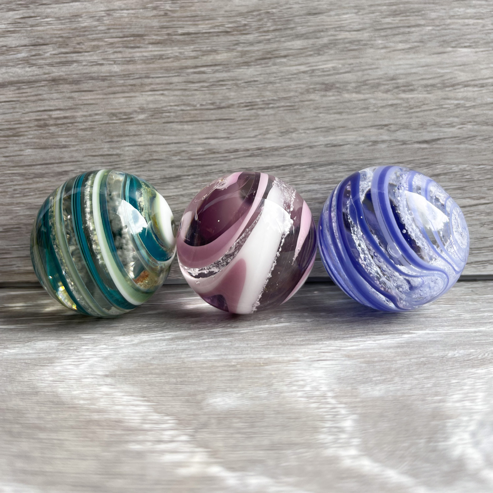 These marbles are a unique way to capture and preserve your loved ones remains. I twist in a color of your choice and a line of the ashes to create these marbles.